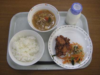 豚汁だけでもうれしい献立ですが、さらに唐揚げがついている!という生徒に人気のメニューです。カロリーはうれしくない897kcalです・・・。