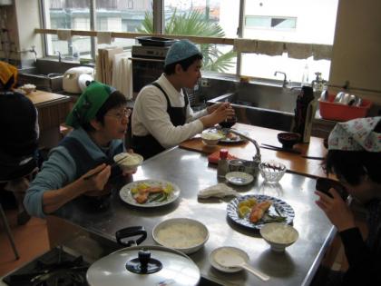 今回は、「鮭のムニエル」「野菜のスープ」「ご飯」です。鮭は、九品仏商店街の魚屋さんにお願いして、生徒用の大きさに切っていただきました。