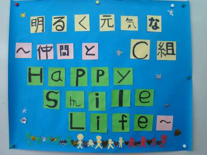 新入生5名を迎え、計14名でC組の27年度の生活が始まりました。慌ただしく過ぎた1週間でしたが、みんなで話し合ってクラス目標を決めました。今年度のクラス目標は「明るく元気なC組〜仲間とHappy Smile Life〜 」です。掲示物も協力して作成しました。1年間宜しくお願い致します。