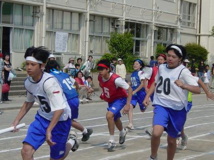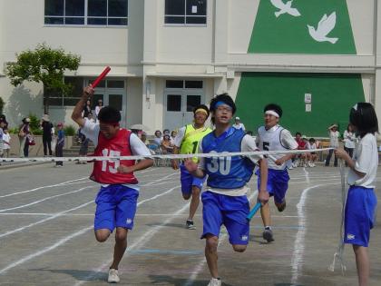 そして、午後の部最後の競技は、「紅白対抗リレー」です。紅白それぞれ各学年男女1名ずつが2チームを作り、4チームでの競争です。