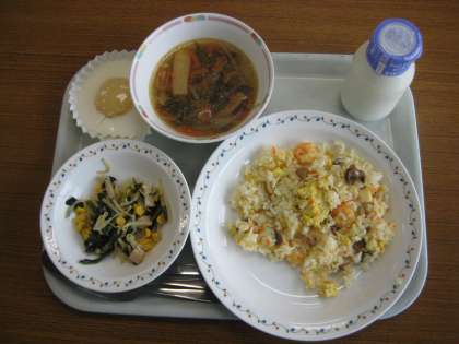 「シーフードピラフ・中華スープ・ほうれん草サラダ・おかしなたまごやき」という献立でした。