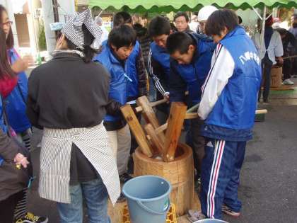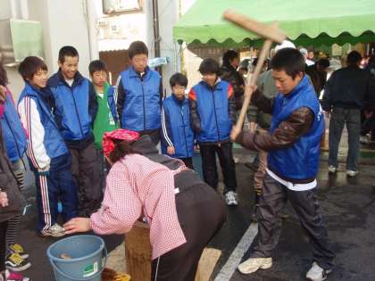 今回もそのベストを着て、はじめは「餅つき」です。男子生徒はまず4人でこね、その後交替しながら8人で餅を搗きました。