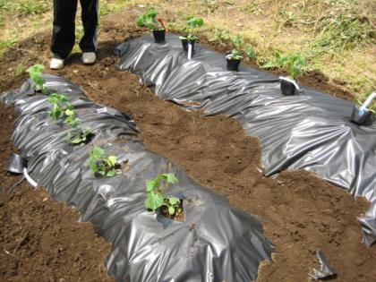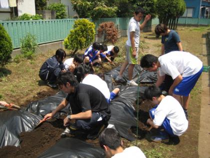 5月26日、今日のC組の理科の授業では、少し時期が遅くなりましたが、うねをつくり、「キュウリ」「トマト」「なす」の苗を植えました。黒いビニールをかぶせ、マルチングしました。昨年度はマルチングしていなかったのですが、主事さんからアドバイスいただき今年度から実施してみました。