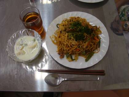 今年度4回目の調理実習のメニューは、「特製八幡ソース焼きそばとフルーツヨーグルト」です。焼きそばのソースは、いくつもの調味料を混ぜ合わせて心を込めて作りました。とっても美味しく出来上がりました。今回も買い物実習や調理実習に地域のボランティアさんにご協力いただきました。次の実習も楽しみです。