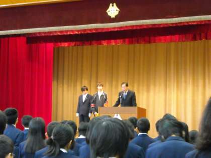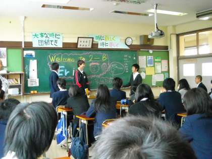 3月10日の全校朝礼での歓迎式を行いました。エリック君は日本語で挨拶をしてくれました。その後、2年B組でクラスの歓迎会を行いました。
