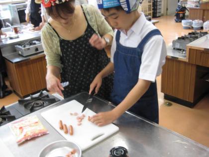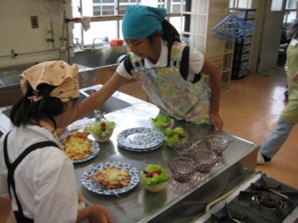 6月4日(水)、C組は調理を行いました。今日のメニューは、「ピザ・グリーンサラダ・フルーツポンチ」でした。ピザの生地は、家庭科の先生が準備してくださったので、上にのせる具の下準備をして、「グリーンサラダ・フルーツポンチ」をつくりました。今回も地域の方々が学習ボランティアとして参加してくださり、生徒たちへの学習支援や補助をしていただきました。特に、1年生はまだ包丁をつかった作業に慣れていないので、ボランティアの方々がいらっしゃるおかげで、とてもスムーズに調理を進めることができます。感謝申し上げます。