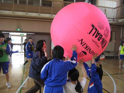 3月23日(火)に2年生の球技大会、24日(水)に1年生の球技大会が行われました。競技の種目はキンボールです。A・B組の生徒と一緒に楽しみました。