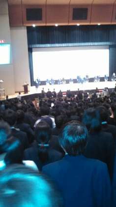 区民会館で本校の2年生も出演し、1年生も楽しそうに聞いています。写真は4ブロックの発表時のものです。