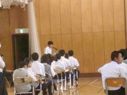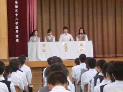 5月13日5,6時間目に本年度の生徒総会が開かれました。各委員会から活動方針が提出され拍手で承認されました.