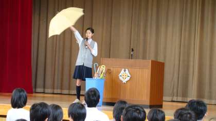 生徒会長から「盲導犬募金活動」の話、生活委員長から「傘の忘れ物・記名について」の実演入りの話、体育委員長から「運動会の練習について」の話がされました。