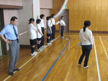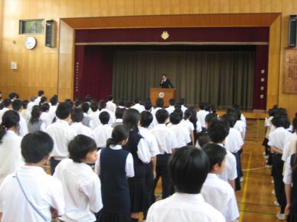 生徒会長からは、八幡小親子盆踊り大会(7月19日)のボランティア活動への参加依頼がありました。全校朝礼はいつも、生徒会が中心になって司会進行をしています。また、放送委員会の生徒たちがマイクの準備をしています。