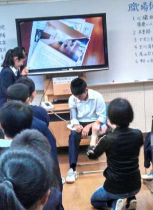 クラスの代表者が視聴覚室で発表しました。写真は血圧を測定しているところです。