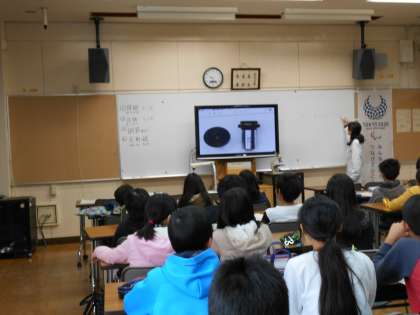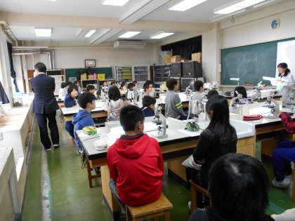 12月13日に九品仏小学校の5年生が本校で理科の授業を行いました。内容は「顕微鏡の使い方」で、視聴覚室で実物投影機を使いながら使用方法を学び、理科室に移動して実際に使いました。皆、積極的に授業に参加していました。