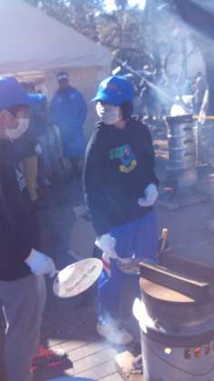 かまど係は煙対策のため、マスク等をして頑張っています。その他にも、ゴミの分別係やヒップホップダンスなど様々な仕事を行っています。