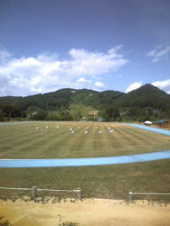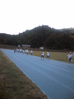 7月30日、陸上競技部も宿舎から2㎞離れた陸上競技場で、真夏の日を浴びながら、午後の練習をしています。はじめに芝生でストレッチを入念にしたあとは、青のタータントラックでの練習です。競技場は八幡中の陸上部だけで独り占め。伸び伸びと、そして一生懸命に練習しています。写真はストレッチと腿上げの練習です。