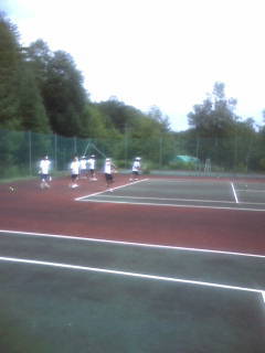 テニス部は午前中、サーブやボレーなどの基礎練習をしています。途中で漆沢先生に質問して指導をしてもらうなど、生徒は積極的に練習しています。