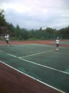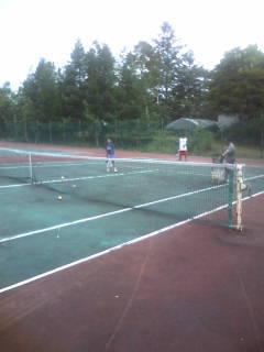 ソフトテニス部は午前中、陸上競技場と体育館近くのトレーニングルームで、基礎トレーニングをしました。午後はテニスコートで基礎練習をしています。部員は3人ですが、先生と一緒に練習しています。