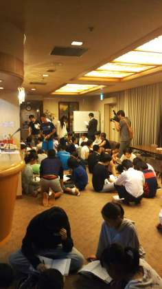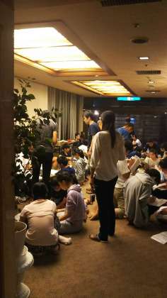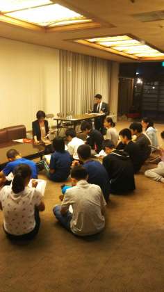 夕食を各部屋で食べました。食事後、ロビーで実行委員会、班長会を行いました。引き続き班会議を行い、明日の京都班行動での注意することを確認しました。
