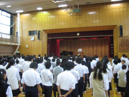 始業式では、校長先生から「目標に向かっての継続的な努力」について、北京オリンピックの水泳の北島選手や女子ソフトボールチームを例えとしてお話がありました。特に3年生には、進路での目標に向けて、これからの取り組みと努力が大切になるというお話がありました。また、近い将来のことだけでなく、自立に向けて長い期間での目標とそれに向けとの努力についてもお話がありました。