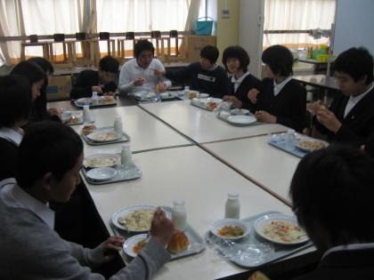 今日は、火曜日なので交流給食でした。CD組に1年A組・2年A組の生徒が来て、一緒に給食をたべました。