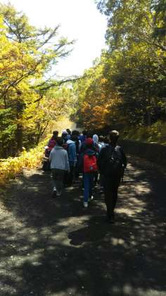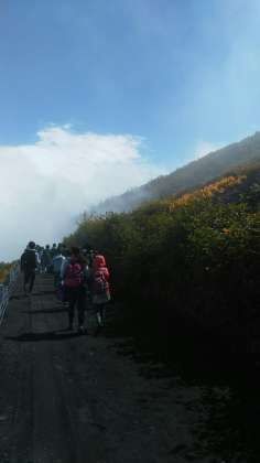 予定通り、富士山五合目に着きました。ふもとは、霧雨。途中は雲、霧の中でしたが、五合目は雲の上に出て晴れてました。上着を着ても少し寒かったですが、元気に散策をしました。