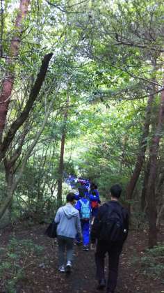 1時にコウモリ穴に向けてハイキング、出発しました。森の中を1列になり、元気に進みました。