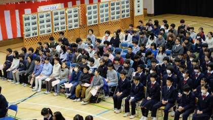 立青式は中学2年生が意見発表をするとともに、地域の方々から14歳を迎える生徒の前途をお祝いしていただく八幡中学校伝統の行事で、今回は50回の記念すべき会となりました。
