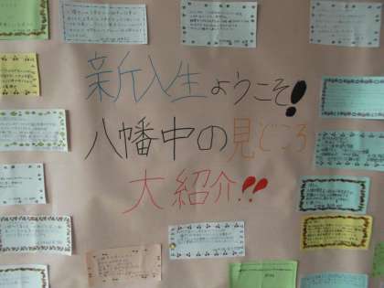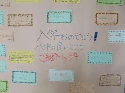 1年生の教室前の廊下には、3年生が書いてくれた「八幡中のよいところ」が飾られています。