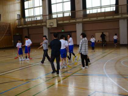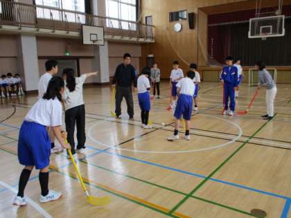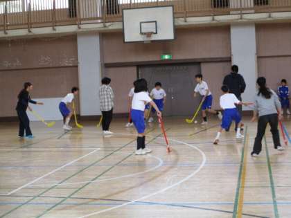 2,3校時、C組は体育館で「ホッケー」に取り組みました。4つのグループに分かれて、対抗戦を行いました。どの試合も接戦で盛り上がりました。