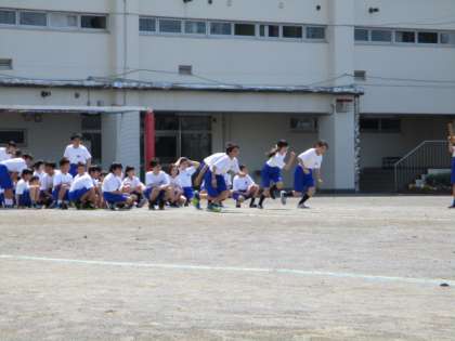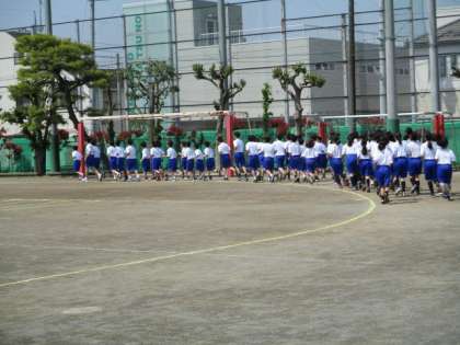 素晴らしいお天気の中、1年生は校庭で保健体育の授業を行いました。初めに男女とも大きな声を出してランニングを行いました。その後、運動会に向けて50m走のタイムを計りました。元気いっぱいです。