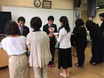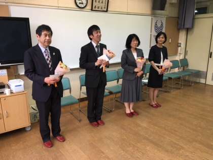 離任式に引き続き、PTAの歓送迎会が行われました。離任された皆さんは、保護者の皆様と懇談し、別れを惜しみました。