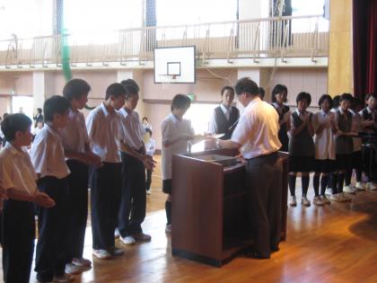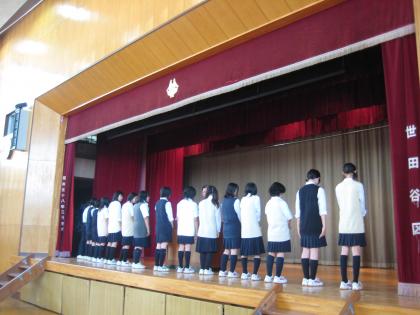 2学期はじめての全校朝礼を行いました。校長先生からは、今月のキーワード「勇気」についてお話がありました。また、吹奏楽部、バスケットボール部、フライングディスク部等の表彰がありました。