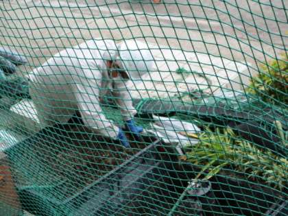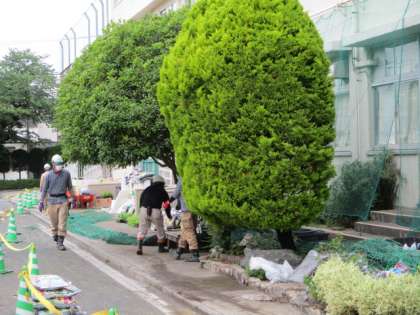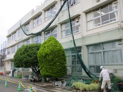 省エネや遮光の役目もある「緑のカーテン」が設置されました。ゴーヤやキュウリが育つのも楽しみです。