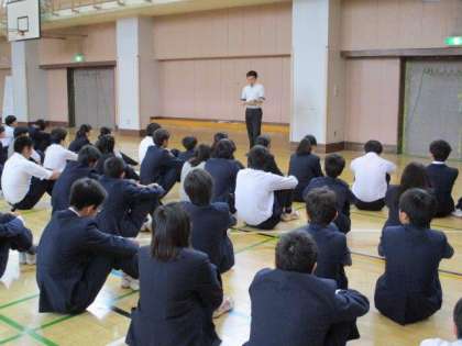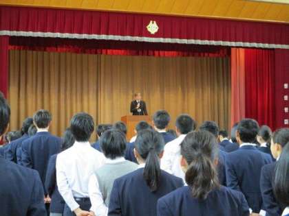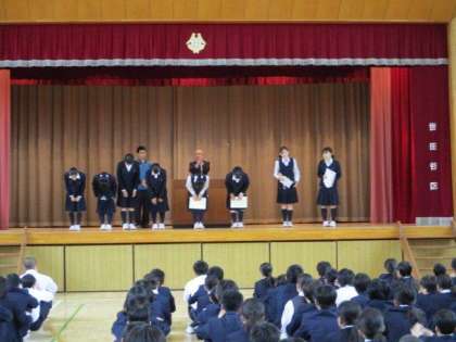 全校朝礼がありました。校長講話では、今後の各学年の行事に向けての心構えとともに、5月の「人格の完成をめざして」のテーマ「思いやり」について話がありました。表彰では、バドミントン部女子が世田谷区春季大会で団体優勝に輝き、チームと上位入賞した生徒の表彰を行いました。朝礼に続いて3年生は、明後日に迫った修学旅行に向けての確認が体育館で行われました。。
