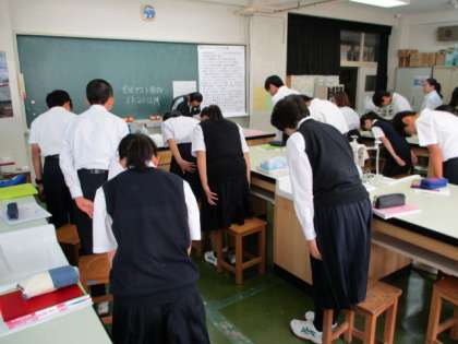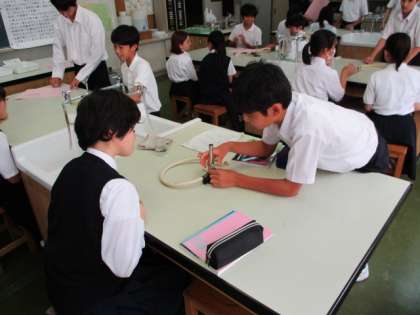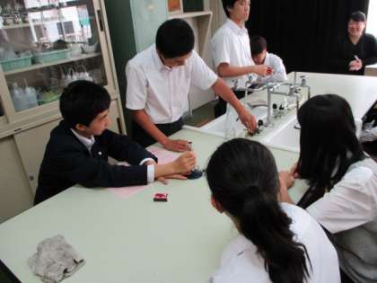 5月17日、1校時・3時の理科の授業で、1,2年生合同授業を行いました。「実験器具の操作に慣れよう」の題材で、ガスバーナーの使い方について班ごとに2年生が1年生にやり方を指導し最後に2年生の監督の下、1年生一人ひとりがガスバーナーを正しく扱えるかのテストを行いました。