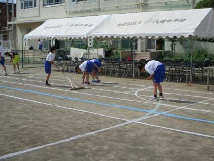 明日の運動会に向けての前日準備を行いました。テントを張り、いすや机を準備し、最後は、グランドを整えました。係生徒は一生懸命に準備をしてくれました。