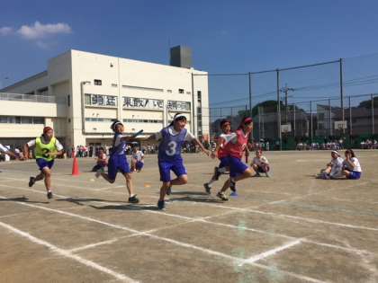 最終種目、紅白代表リレーです。迫力ある走りです。2チームが同着1位の大接戦でした。