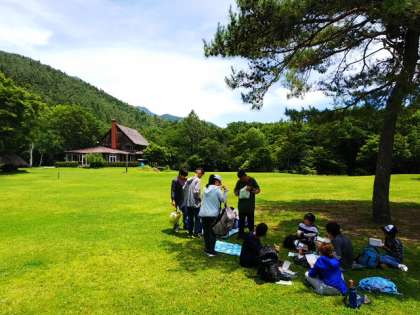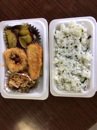 昼食のメニューは、「わかめごはん、魚とイカのフライ、切り干し大根煮付、マカロニソテー、大学芋、ゆでアスパラ」です。