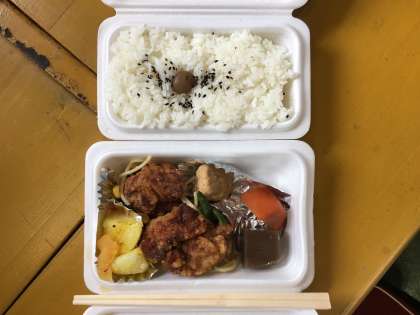 移動教室最後の食事です。メニューは「ごはん、鶏肉の竜田揚げ、カレー粉ふきいも、煮付け、いんげんソテー、漬け物」でした。学園の職員の皆さん、三日間ありがとうございました。