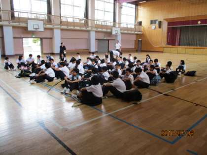 7月9日放課後、防災訓練を行いました。今回は集団で下校する際の訓練として地区班に分かれて、各班の担当の先生から集団下校する際の諸注意などを説明しました。
