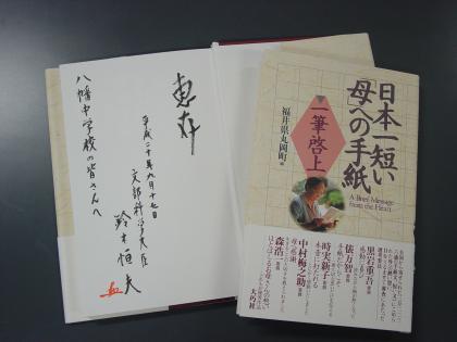その際に、教科「日本語」は、大臣が成立にご尽力された「文字・活字文化振興法」の趣旨に沿うもので、これからの取り組みに期待しますとのお言葉をいただきました。また、平成22年を「国民読書年」とし、言語力の向上を図りたいというお話しとともに、「日本一短い『母』への手紙〜一筆啓上〜」を図書室に2冊寄贈していただきました。2冊の本には大臣のご署名もありました。ありがとうございました。
