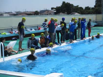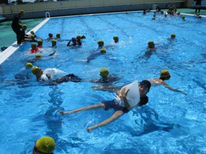 1学期最終日の20日、1学年保健体育の授業で「着衣泳法」の実習授業を行いました。