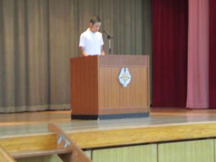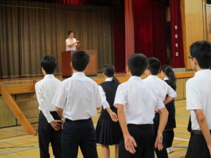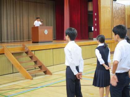 5日、2学期最初の生徒朝礼が行われました。1年、2年、3年の各学年委員長から、学級委員会の報告や学年への呼びかけが行われました。