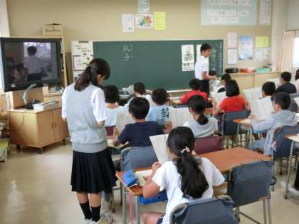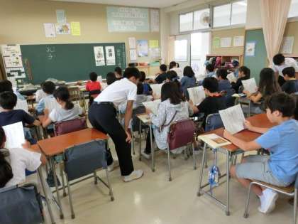 さぎそう学舎では、中学校の教員が小学生に授業を行う「学び舎協力授業」を実施しています。今日は八幡小学校で中学校の教員が小学5年生に国語の授業を行いました。