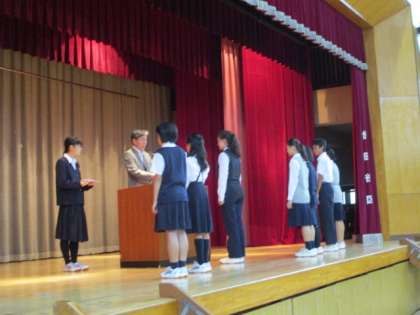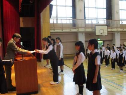 26日、生徒朝礼が行われました。先日の生徒会役員選挙で選出された新生徒会役員7名に「任命書」が渡されました。学校のため、全校生徒のために1年間よろしくお願いします。