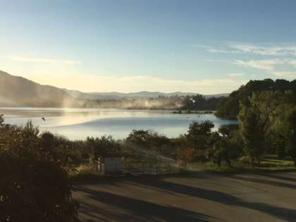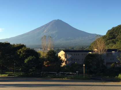 おはようございます。連合移動教室2日目の朝を迎えました。今日も良い天気です。学園から見える富士山と河口湖の様子です。