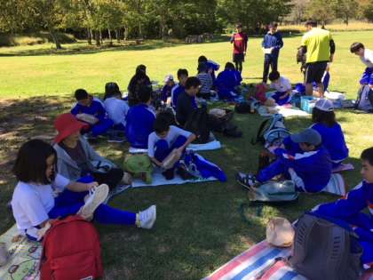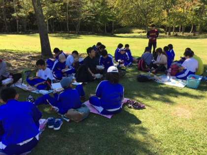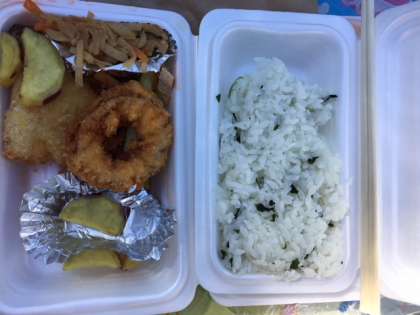 お弁当です。メニューは「わかめごはん、魚とイカのフライ、切り干し大根、マカロニソテー、大学芋、ゆでアスパラ」でした。