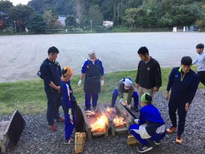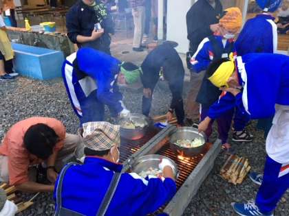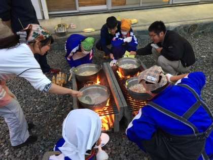 かまど係が一生懸命火を起こして鍋で調理しています。