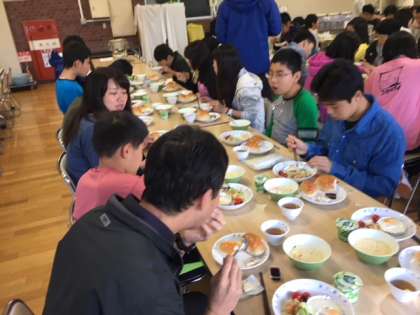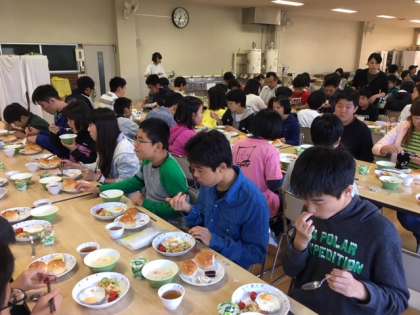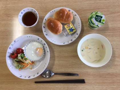 最終日の朝食です。メニューは「パン(バター、ブルーベリージャム)、ベーコンエッグ、サラダ、コーンスープ、アロエヨーグルト」です。学園での最後の食事。感謝しながら食べました。