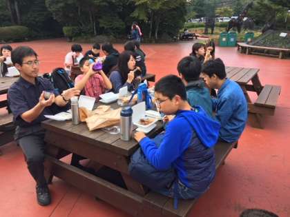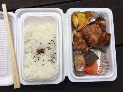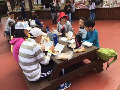 見学の後はお昼のお弁当です。移動教室最後の食事です。メニューは「ごはん、鶏肉の竜田揚げ、カレー粉ふき芋、煮付け、いんげんのソテー、つけもの」です。